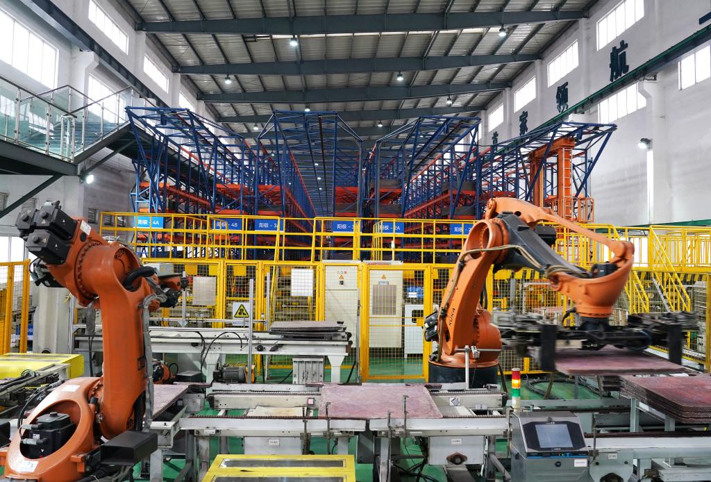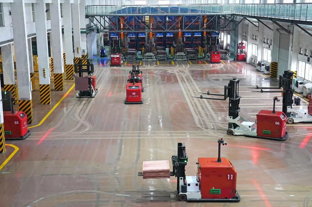 自2016年启动智能工场一期扶植,智能机械人转运铜板(1月21日摄)。